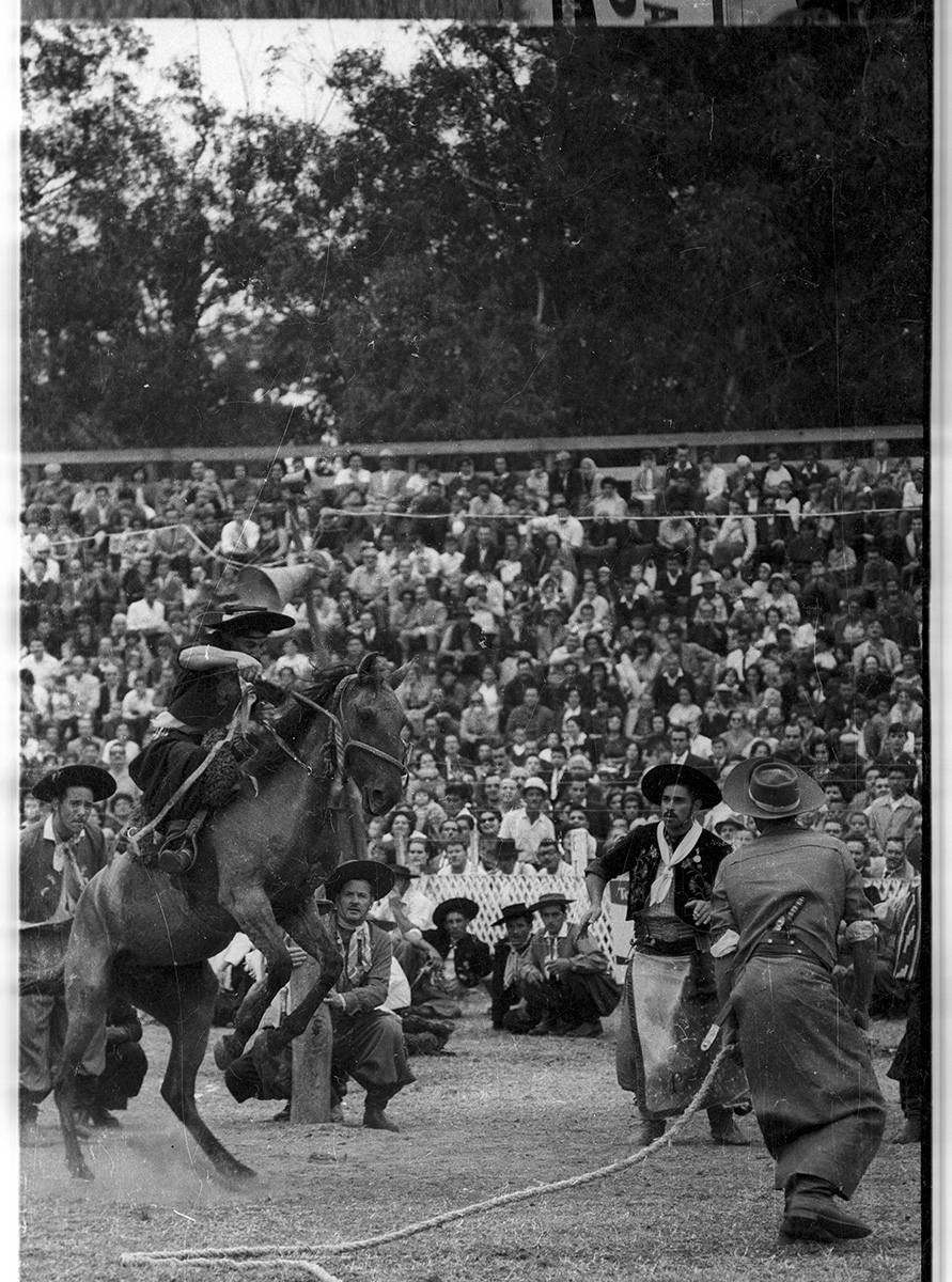 Concurso de jineteadas durante la Semana Criolla. Predio de la Asociación Rural del Uruguay.