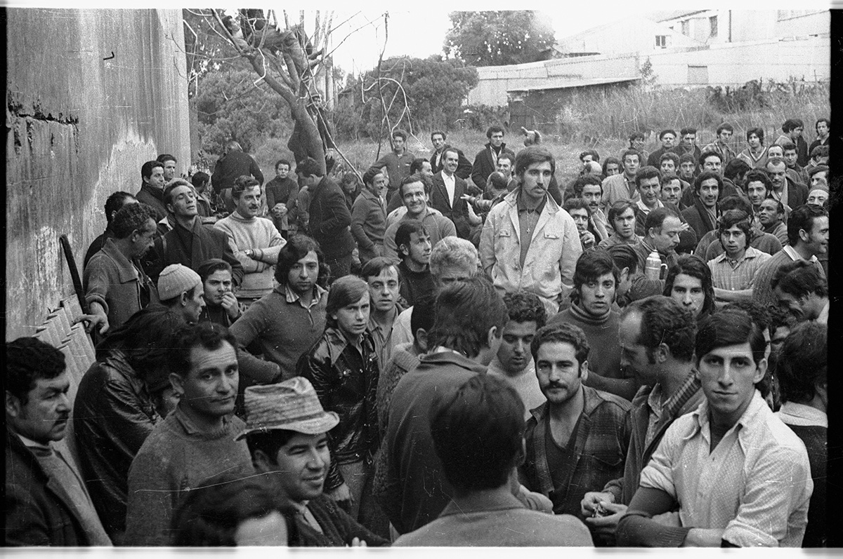 Asamblea de trabajadores de la construcción a la entrada de la Fábrica Nacional de Cemento Portland. Calle María Orticoechea.